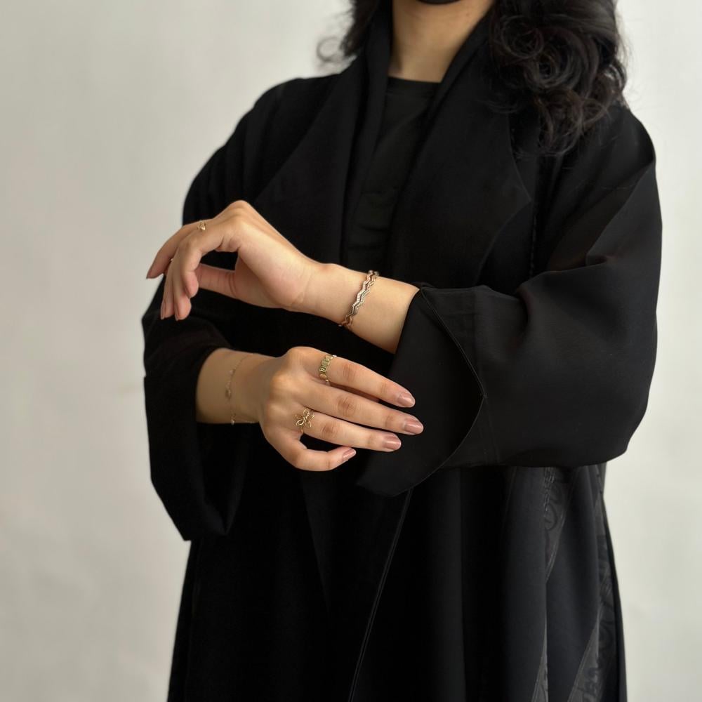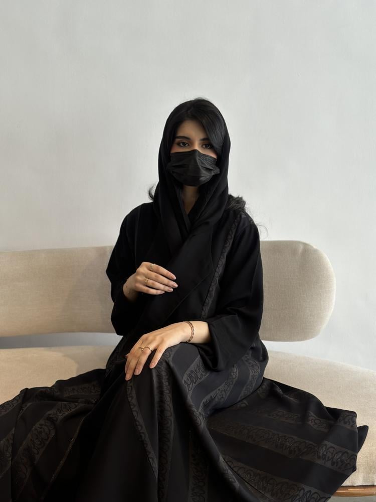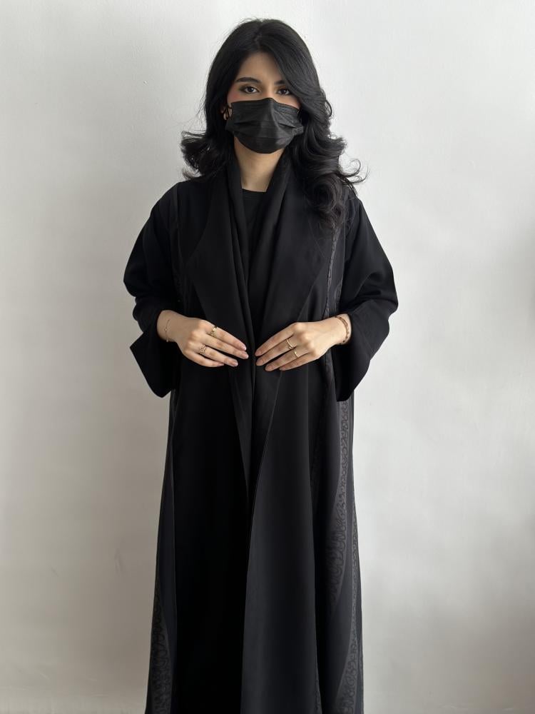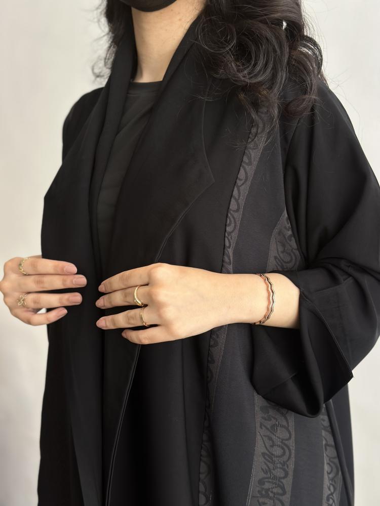 عباية بحروف عربية مصممة من كريب أسود مع تفاصيل جاكار لأحرف عربية على الجوانب وقصة كلوش تضفي لمسة من الرقي مع طرحة سوداء تكمل إطلالتكِ بشكل مميز.
